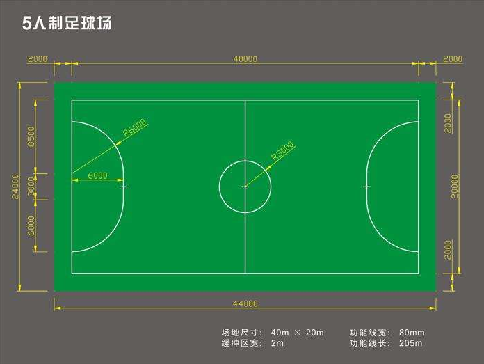 以上為標(biāo)準(zhǔn)5人制足球場(chǎng)尺寸參考尺寸,實(shí)際場(chǎng)地可根據(jù)當(dāng)?shù)厍闆r因地制宜